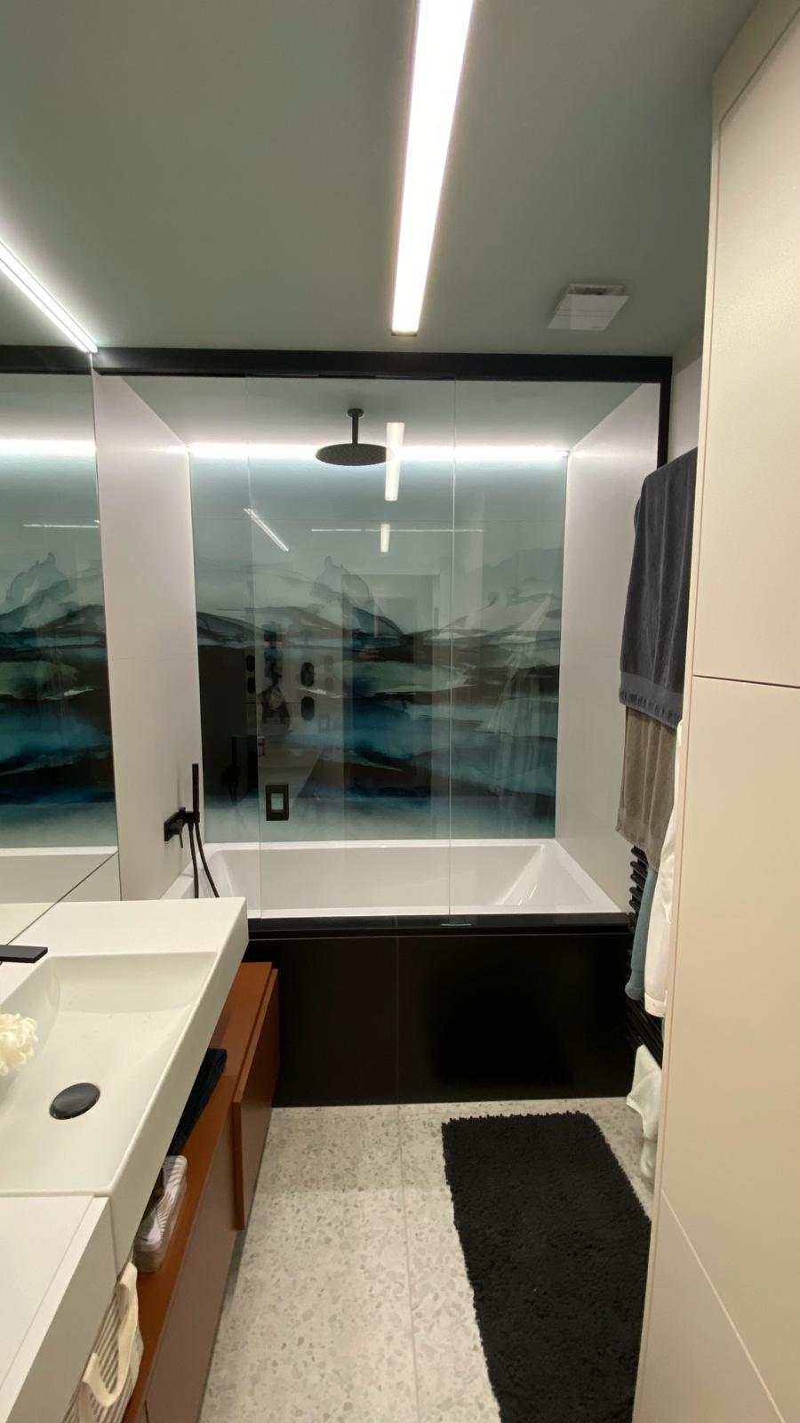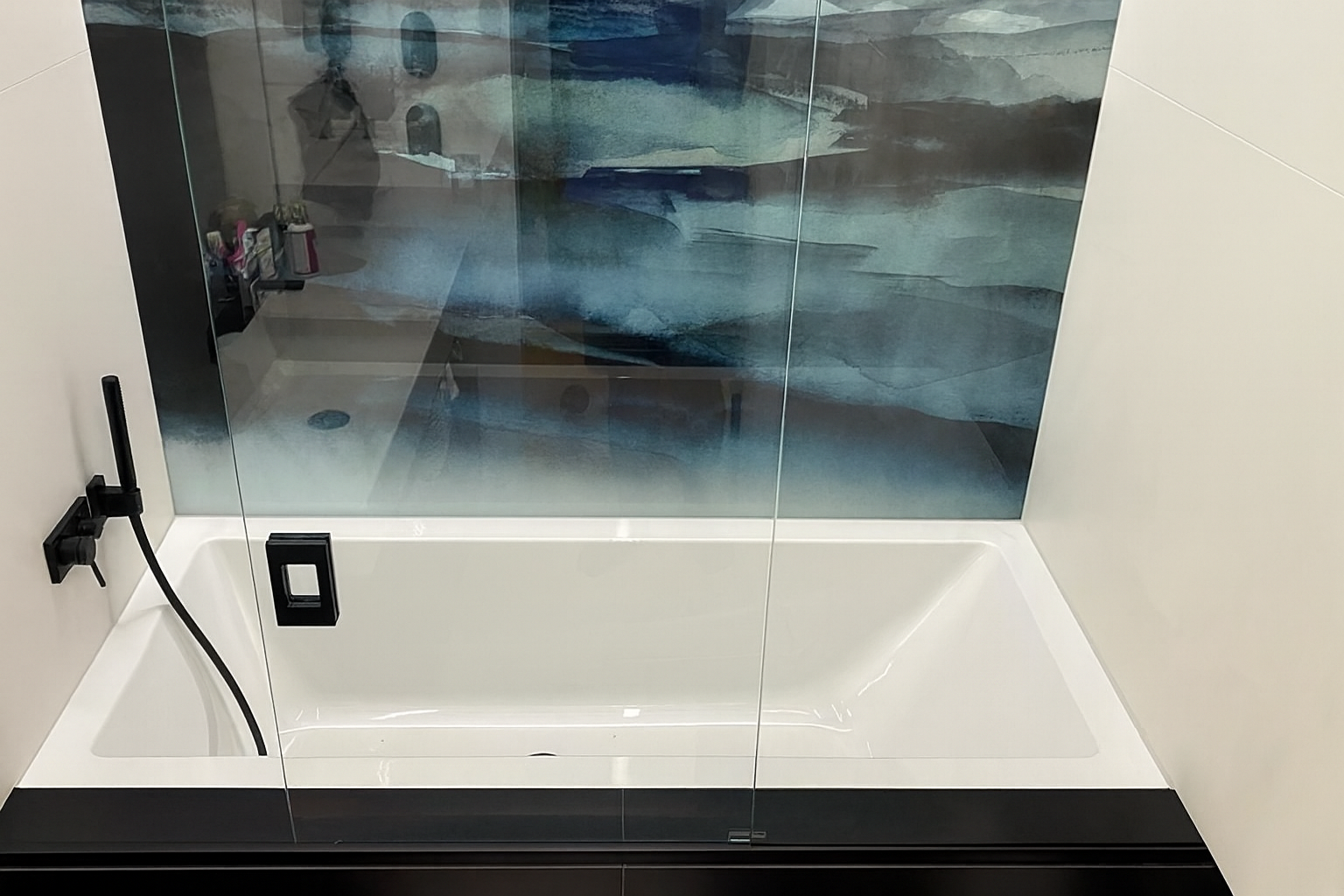 Skleněný obklad umístěný za vanou je vyroben ze skla Fotoglas fire o tloušťce 6 mm. Tento typ skla je opatřen speciálním keramickým potiskem, díky kterému výborně odolává vlhkému prostředí i teplotním výkyvům a zároveň si dlouhodobě udržuje stálou barevnost. Vybraný motiv – abstraktní kompozice v odstínech modré – dodává koupelně výrazný charakter a funguje jako dominantní estetický prvek.