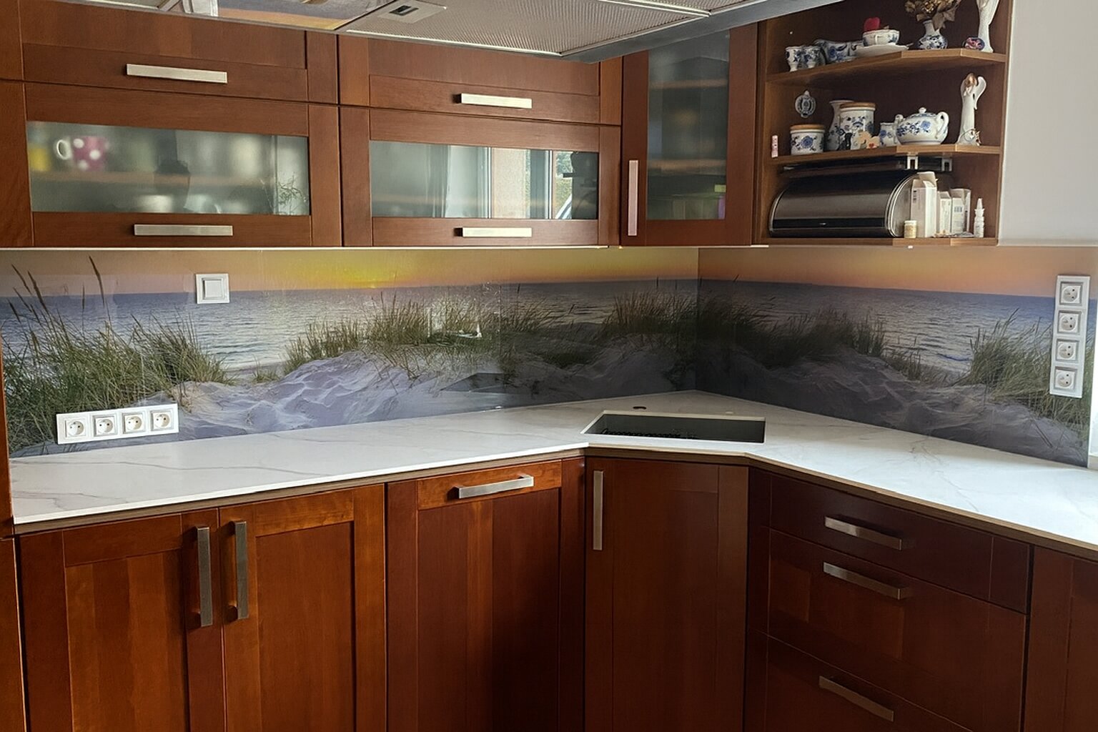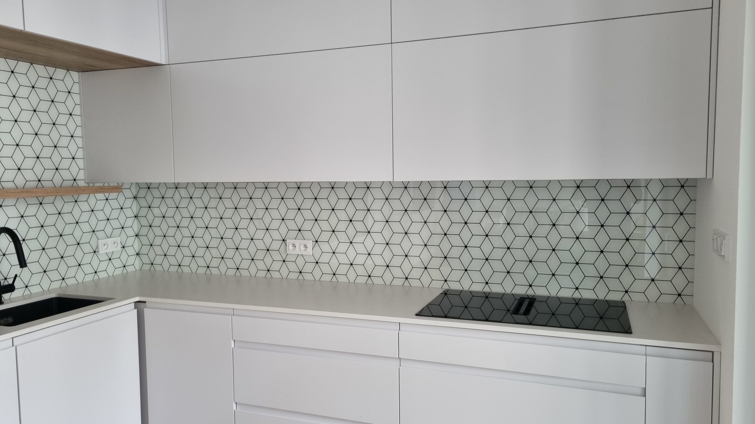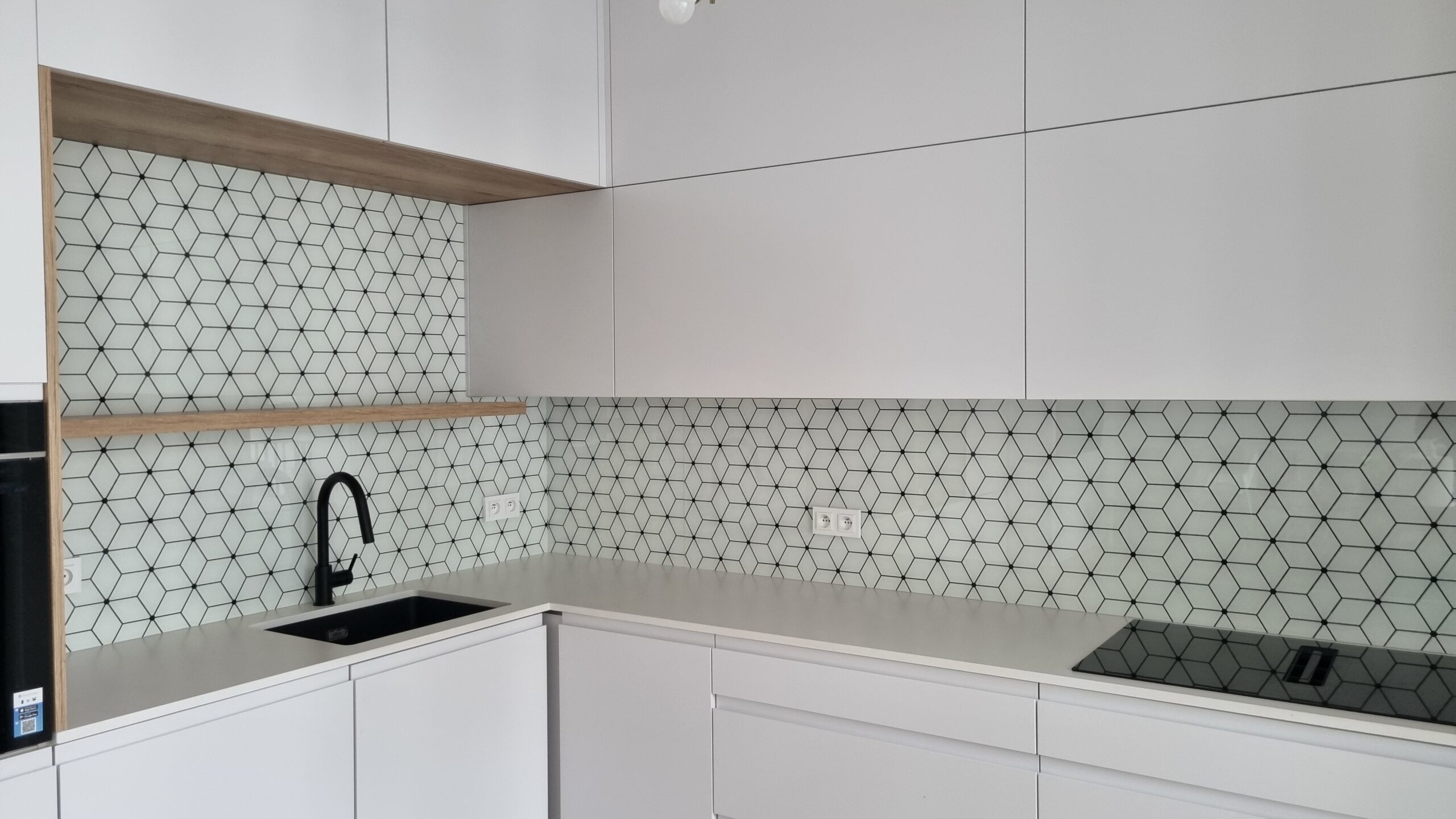 V této realizaci skleněného obkladu za kuchyňskou linkou jsme použili FotoGlass UV diamant o tloušťce 6 mm s motivem z databáze Shutterstock. Cihly jsou vytištěny v reálné šířce 25 cm, ve vodorovné, polovičně přesazené vazbě s věrohodnou spárou. Obklad v této kuchyni přirozeně zapadá do skandinávského designu – spojuje čistotu skla s autentickým vzhledem cihel.
