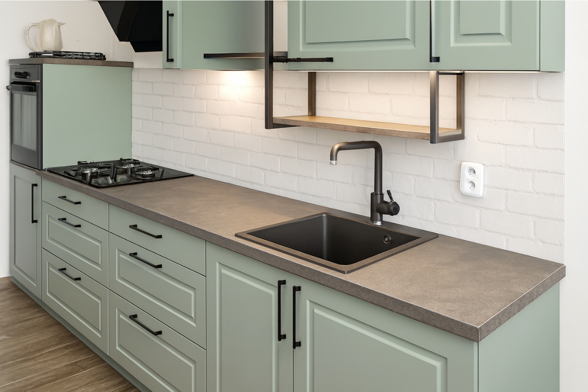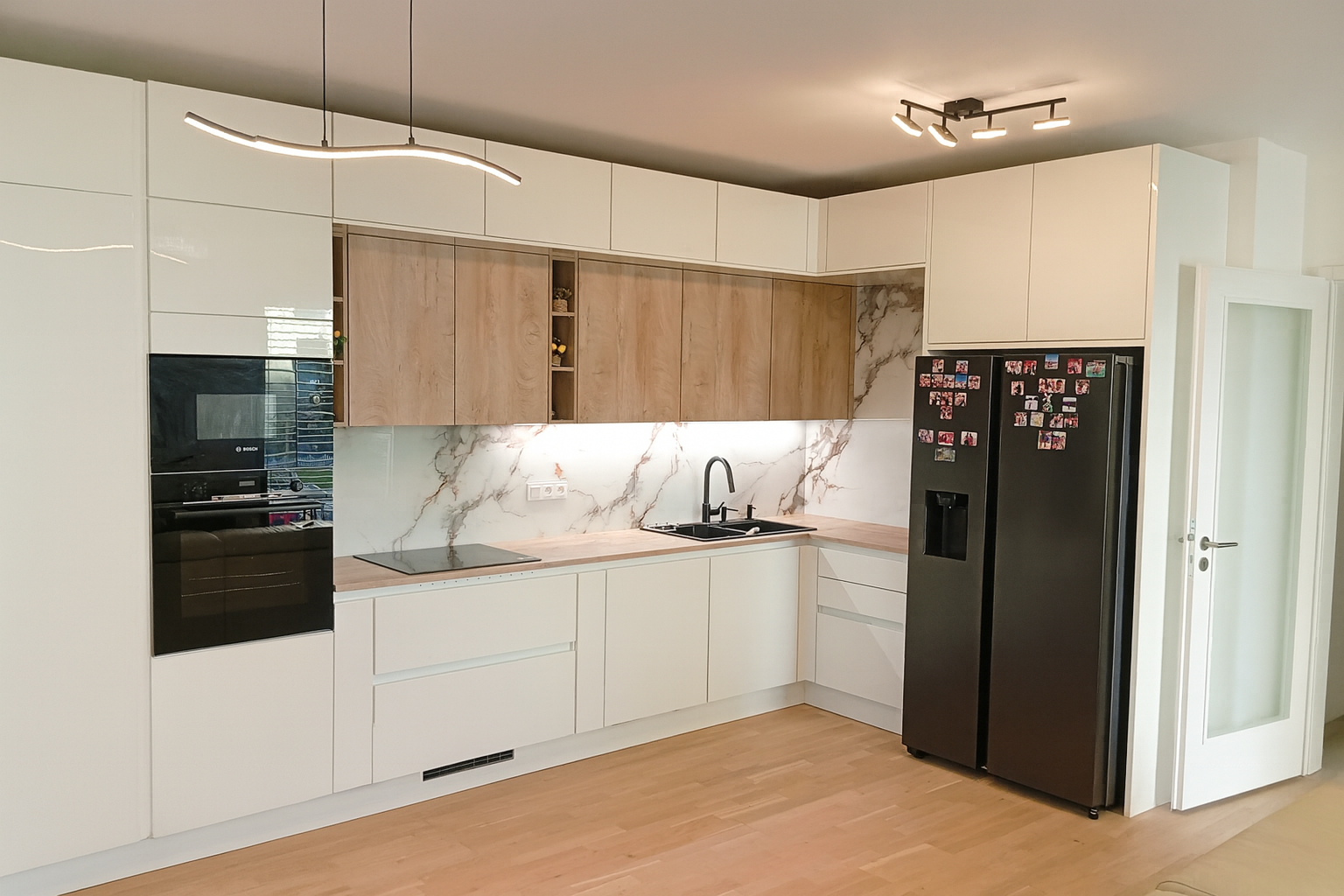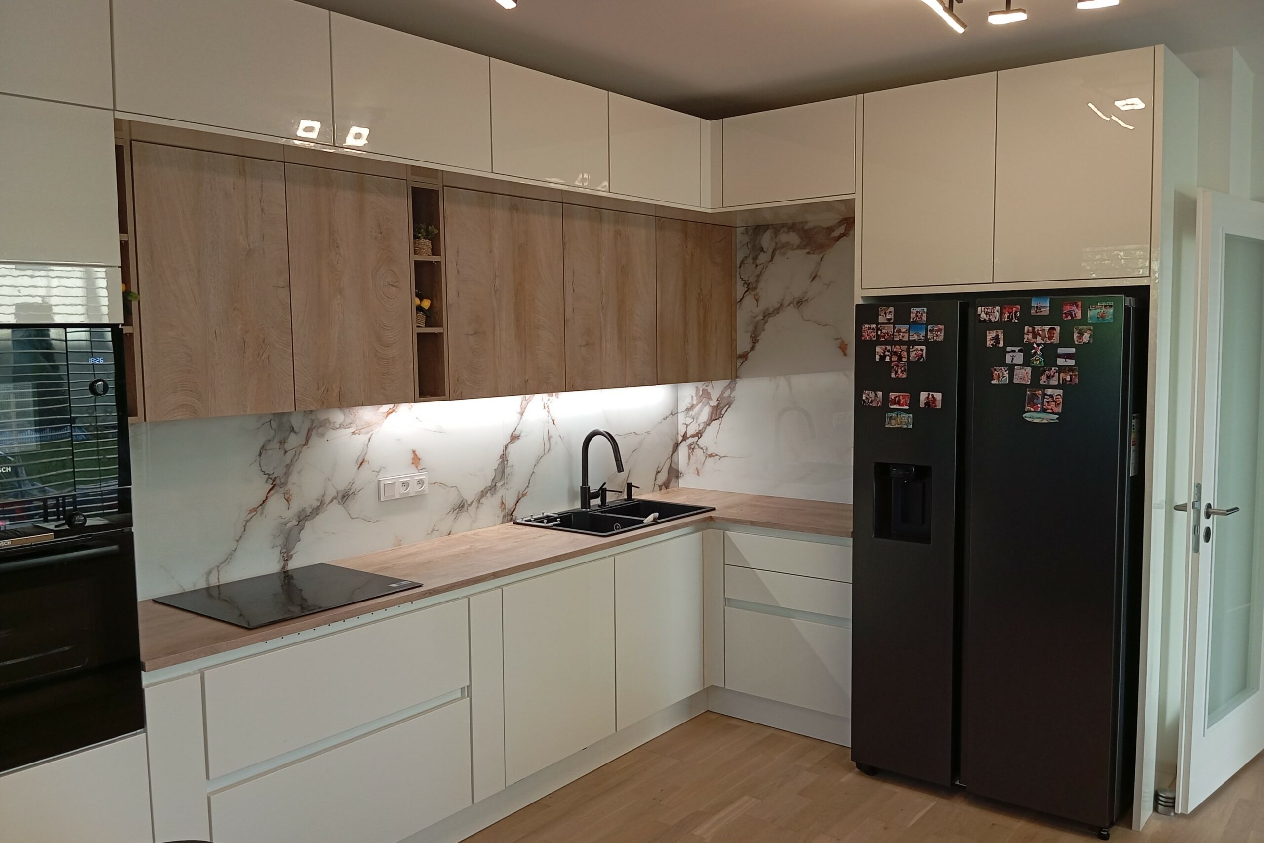 V této realizaci skleněného obkladu za kuchyňskou linkou jsme použili FotoGlass UV diamant o tloušťce 6 mm s motivem z databáze Shutterstock. Cihly jsou vytištěny v reálné šířce 25 cm, ve vodorovné, polovičně přesazené vazbě s věrohodnou spárou. Obklad v této kuchyni přirozeně zapadá do skandinávského designu – spojuje čistotu skla s autentickým vzhledem cihel.