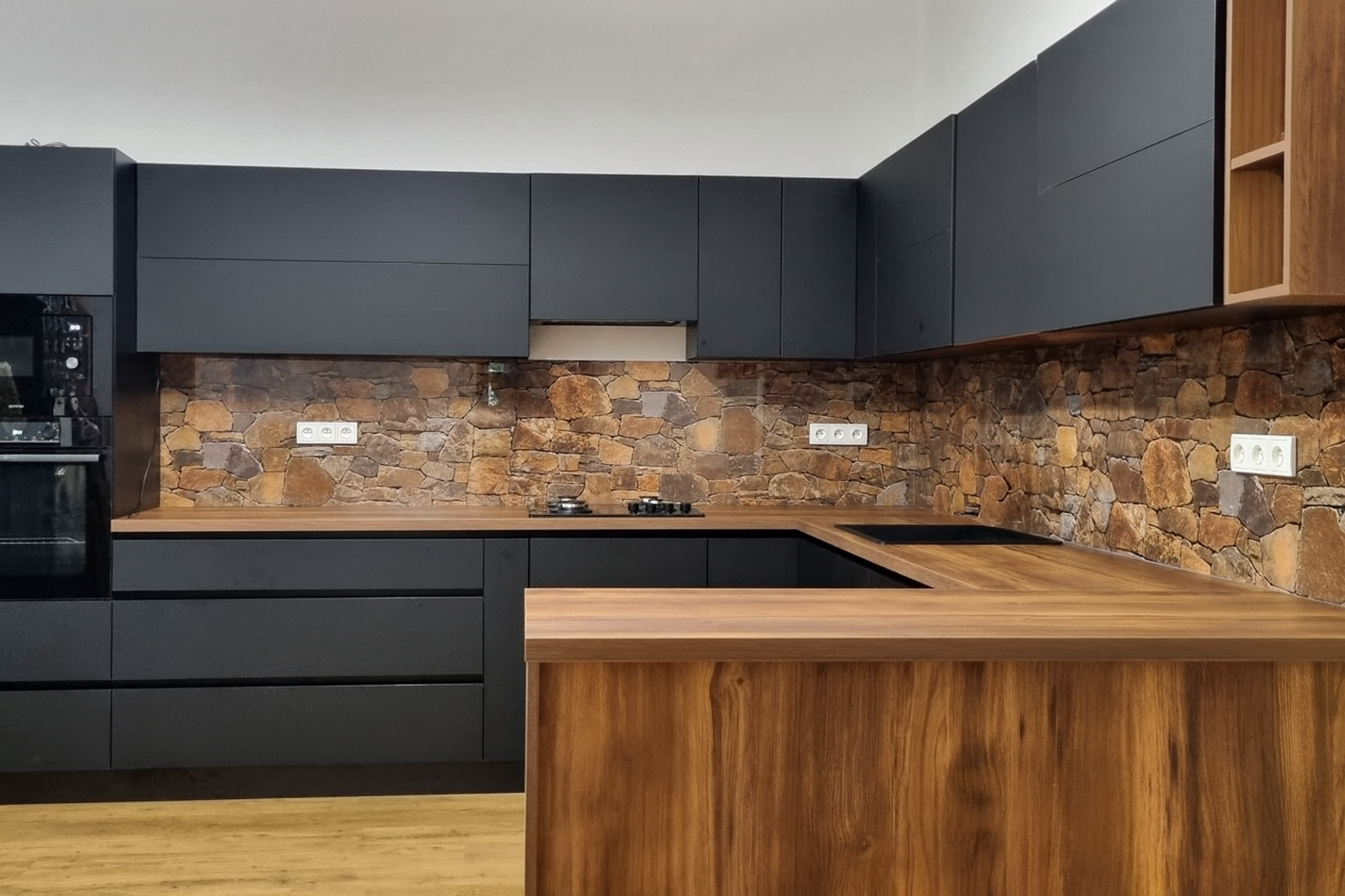 Takto zpracovaný grafický skleněný obklad přináší do kuchyně motiv cihel v podobě, která je praktická pro každodenní provoz a zároveň si zachovává moderní, čistý výraz.