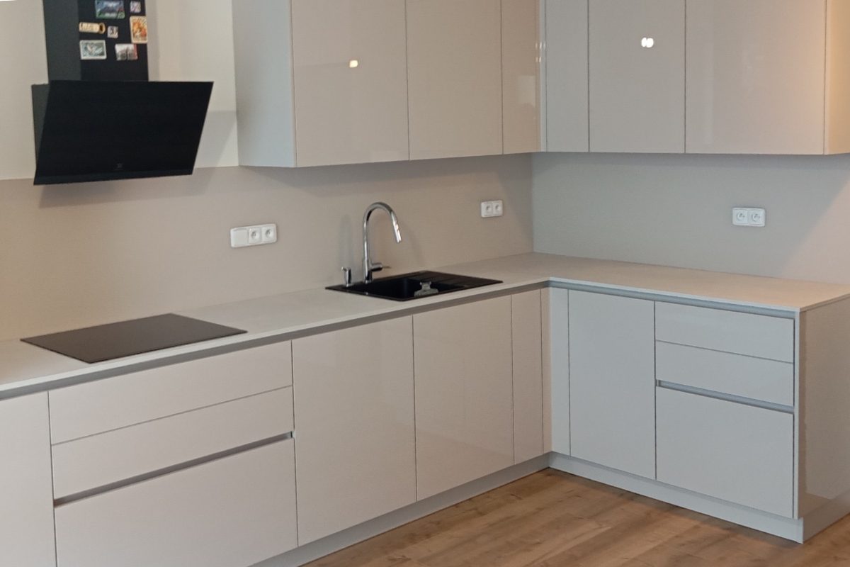 Výsledkem je bílý skleněný obklad, který plynule navazuje na pracovní desku i korpus a působí jako přirozená součást kuchyně.
